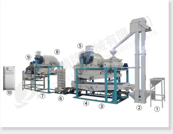 ① 上料斗② 斗式提升機(jī) ③ 脫殼、風(fēng)選、分選主機(jī) ④ 板簧輸送機(jī) ⑤ 立式風(fēng)選系統(tǒng) ⑥ 螺旋提升機(jī) ⑦ 振動(dòng)輸送風(fēng)選機(jī) ⑧ 立式風(fēng)選系統(tǒng) ⑨ 靜電風(fēng)選機(jī) ⑩ 電氣控制柜