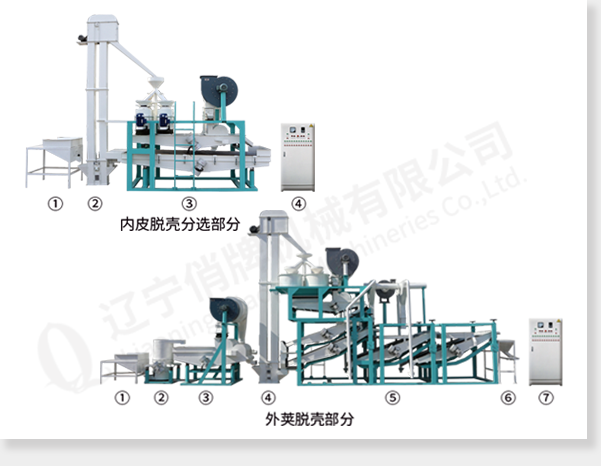 外莢脫殼部分:① 螺旋上料斗 ② 原料提升機 ③ 多功能除雜機 ④ 斗式提升機 ⑤ 脫莢、風選、分選設(shè)備 ⑥ 接料斗 ⑦ 電氣控制柜