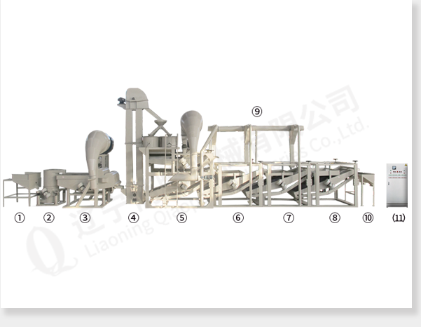 ① 上料斗② 原料提升機(jī) ③ 多功能除雜機(jī) ④ 斗式提升機(jī) ⑤ 脫殼、風(fēng)選、分選主機(jī) ⑥ 籽仁復(fù)選機(jī)1 ⑦ 籽仁復(fù)選機(jī)2 ⑧ 籽仁復(fù)選機(jī)3 ⑨ 風(fēng)力回料系統(tǒng) ⑩ 接料斗 (11) 電氣控制柜