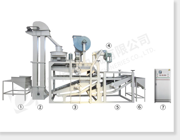 ① 上料斗②斗式提升機 ③ 脫殼、風選、分選主機 ④ 風力回料系統(tǒng) ⑤ 籽米復選機 ⑥ 接料斗 ⑦ 電氣控制柜