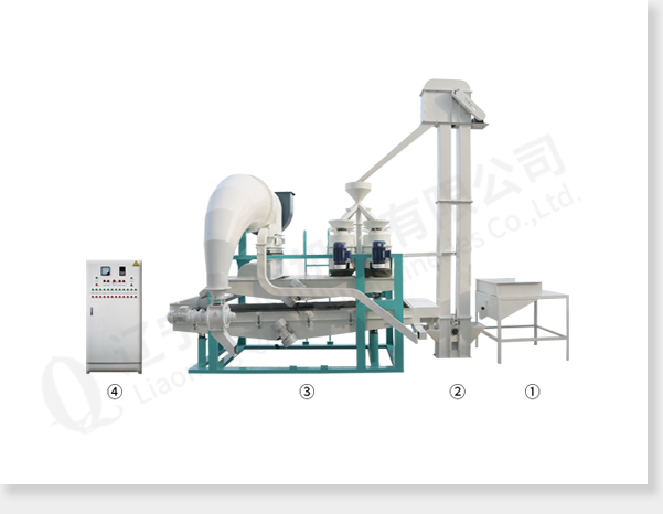 ① 上料斗② 斗式提升機 ③ 脫殼、風(fēng)選、分選主機 ④ 電氣控制柜